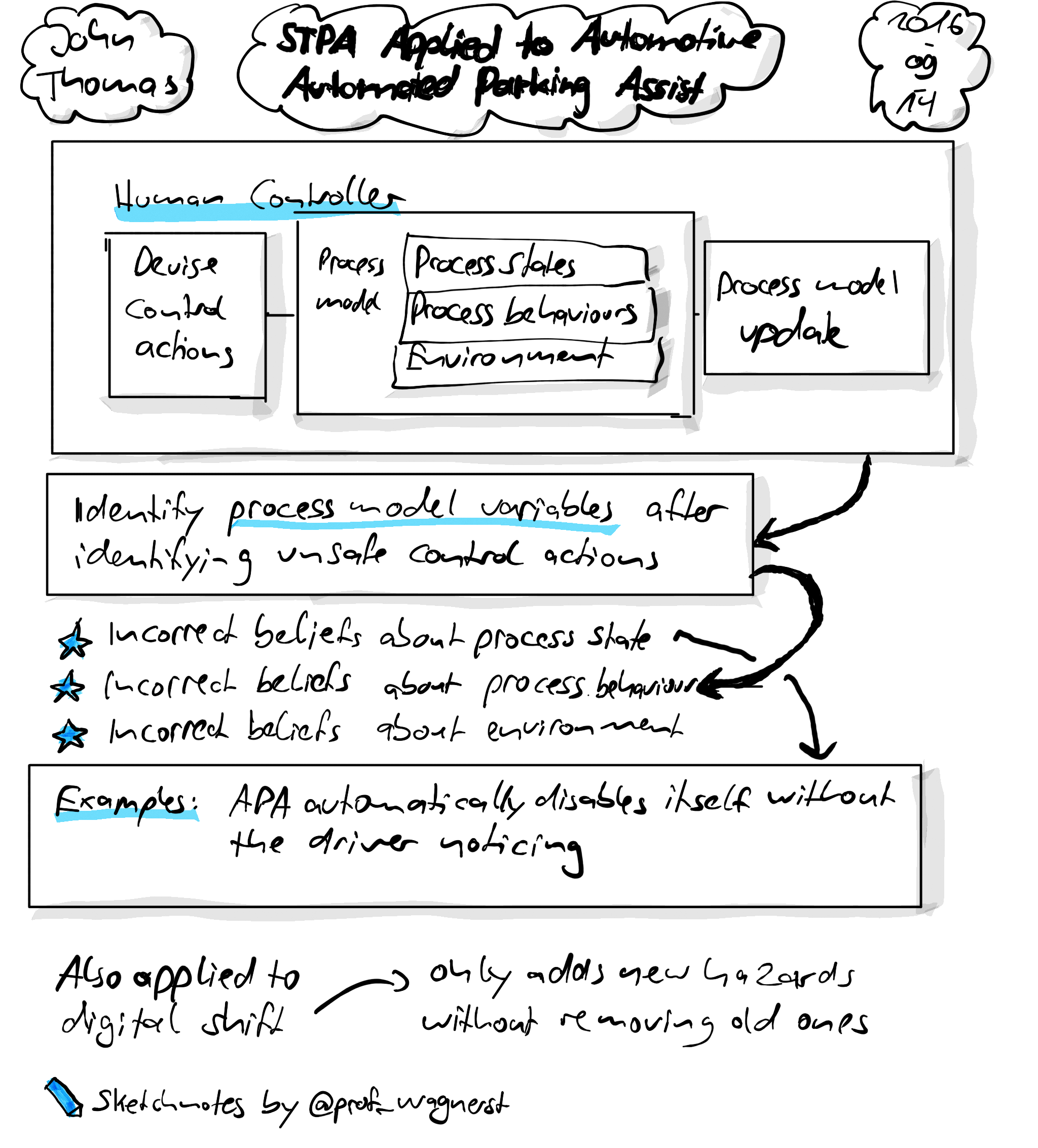 John Thomas from MIT reported on his experiences on applying STPA to more modern automotive systems. Interestingly, they found a lot of influence of the human, and he detailed a bit the process model and the human controller part of the analysis.