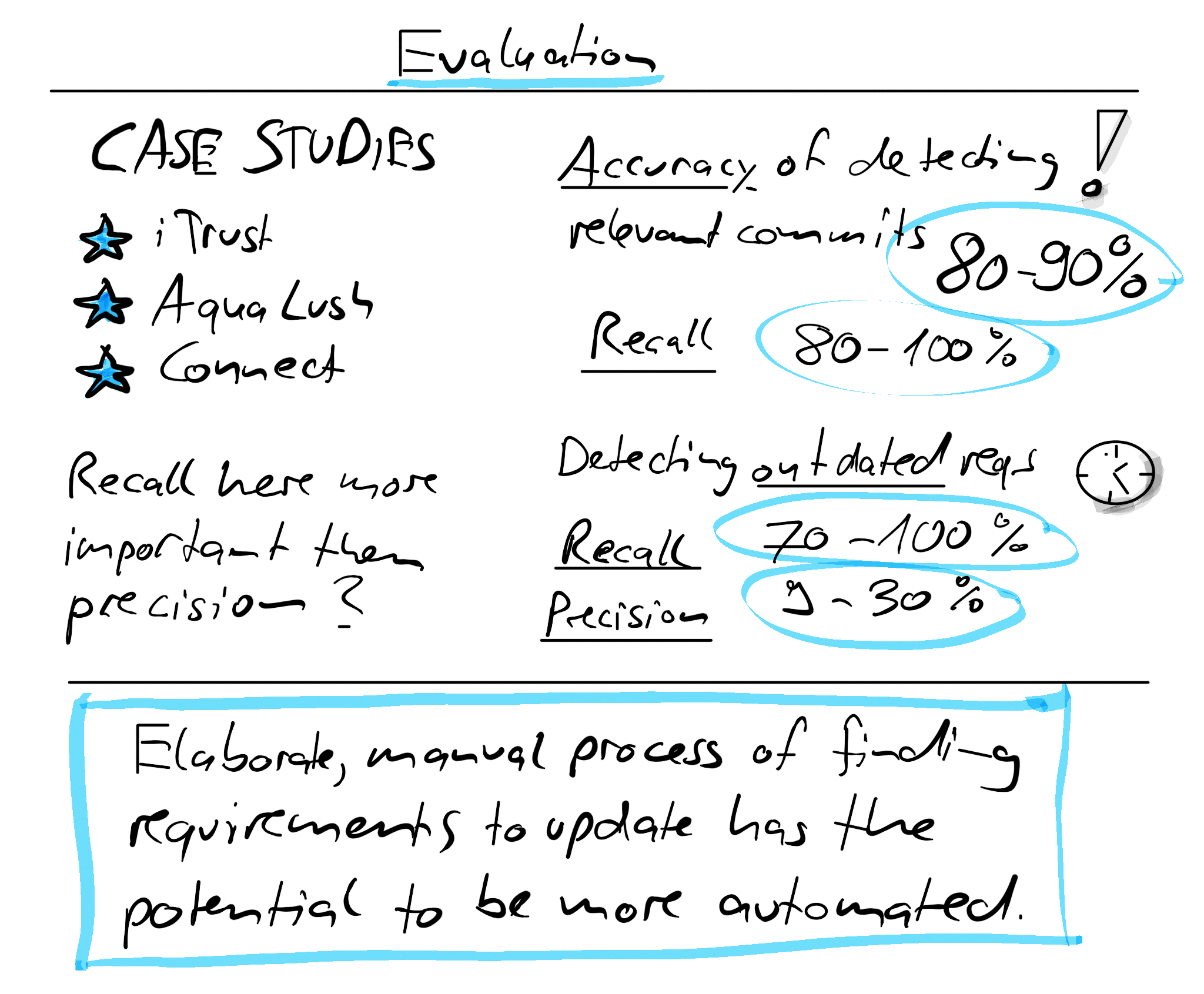 Martin Glinz from the University of Zürich has given an interesting talk on a paper they presented at the RE conference. If you work in a process in which you update "old" requirements, it is difficult to identify which ones. They tried to identify the affected requirements based on a code change.